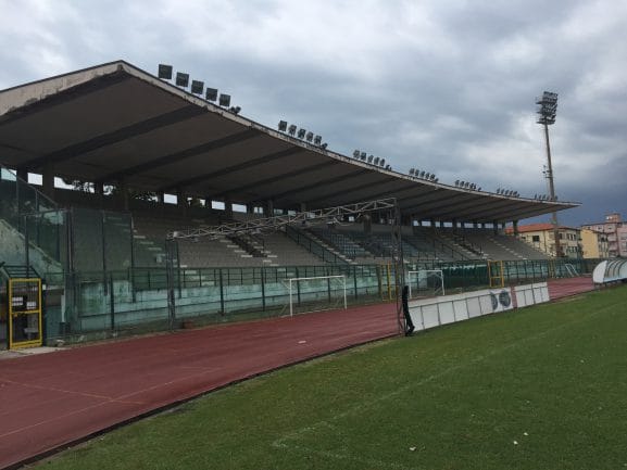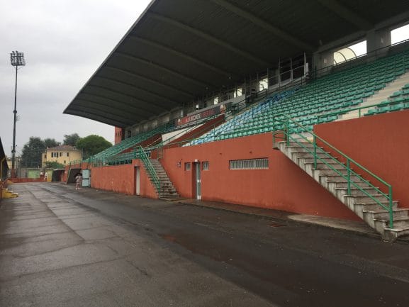 Viareggio kwam in het seizoen 2016-2017 uit in de Serie D, Girone E. De Serie D is in regio’s verdeeld, vandaar de toevoeging. Na een vijftiende plek in de eindrangschikking handhaafde de ploeg zich via de play offs. Het seizoen 2017-2018 is tijdens ons bezoek al enkele weken aan de gang en de start is veelbelovend: na drie wedstrijden zijn er al zeven punten vergaard. Het stadion is klein maar voor een club op dit niveau lijkt me het prima. De hoofdtribune is overdekt en aan de overkant zien we een grote onoverdekte staantribune. Achter beide doelen geen tribunes.