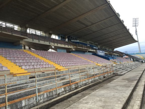 De hoofdtribune is overdekt, de overige drie tribunes zijn dat niet. De regen is inmiddels gelukkig in kracht afgenomen, maar het is nog verre van droog. Dat we alleen op de hoofdtribune rond kunnen lopen, is dus geen ramp. Het stadion biedt plaats aan 7.400 bezoekers, maar die zitten er eigenlijk nooit. In het seizoen 2016-2017 trok de club gemiddeld 1.953 toeschouwers naar de thuiswedstrijden. Wat opvalt is de grote ruimte tussen de hoofdtribune en het speelveld. Dit is een lege ruimte van zeker tien meter breed.